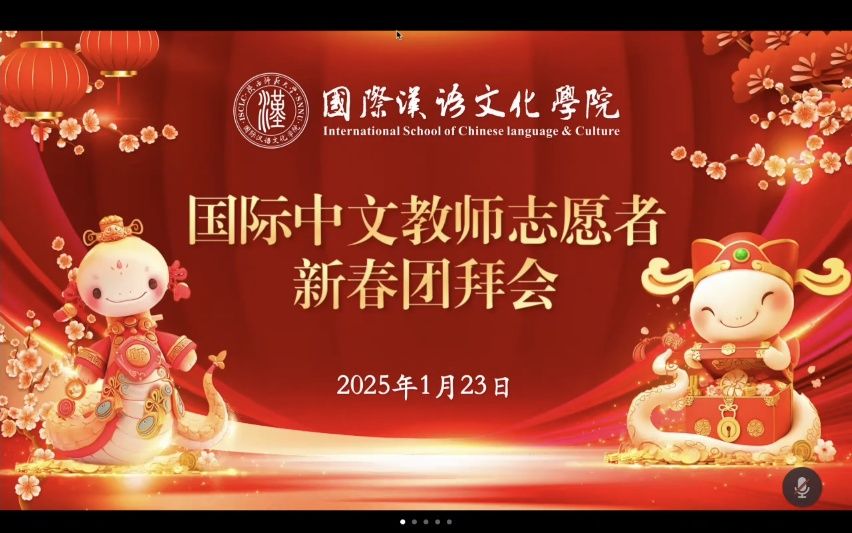2025年1月23日是中国农历的南方小年,值此佳节之际,公司举行国际中文教师志愿者新春团拜会慰问远在异国他乡的志愿者们。国际汉语文化公司党总支书记马兰、经理石洛祥、党总支副书记张昊、副经理孙建伟、辅导员张欣元、国际中文教师志愿者党小组、团支部全体成员以及2025年即将赴任的志愿者同学参加。本次活动由研究生辅导员翁思洁主持。石洛祥代表公司为志愿者致新年贺词。他对远在他乡、无私奉献的志愿者们表示了崇高的敬意和衷心的祝福。...