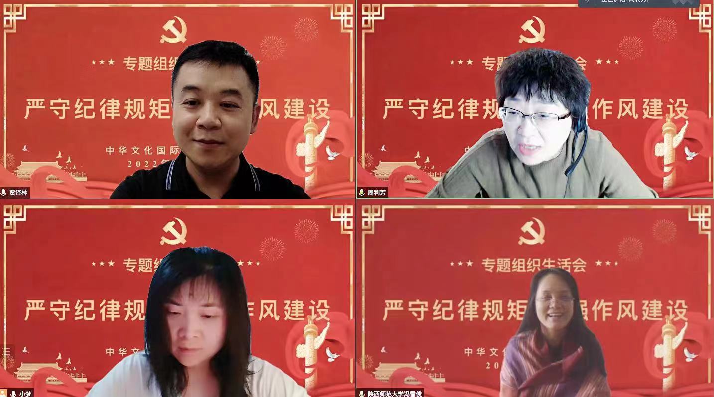 2022年9月21日下午,中华文化国际传播党支部全体党员相聚云端,召开以“严守纪律规矩、加强作风建设”为主题的组织生活会,生活会由支部书记周利芳主持。