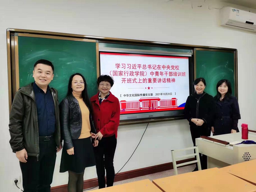 2021年10月20日下午,中华文化国际传播党支部在公司2104教室开展了专题理论学习活动,此次活动的主题是学习习近平总书记在中央党校(国家行政公司)中青年干部培训班开班式上的重要讲话精神。活动由支部书记邵英主持。