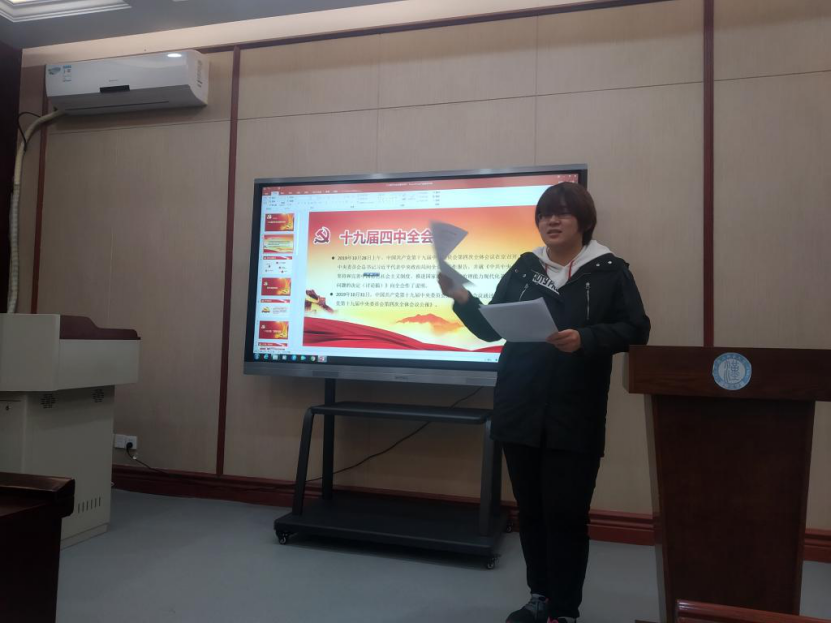 研究生第一支部党员马宇腾同志阐述了十九届四中全会的主题是研究坚持和完善中国特色社会主义制度、推进国家治理体系和治理能力现代化若干重大问题,强调了我国国家制度和国家治理体系在13个方面的显著优势,并对每项优势进行了详细的讲解,增强了研究生党员对十九届四中全会精神的理解,坚定了我们坚持中国特色社会主义制度的制度自信、坚持走中国特色社会主义道路的道路自信。