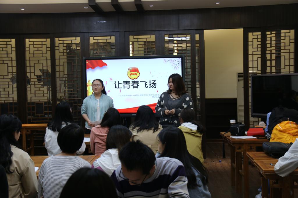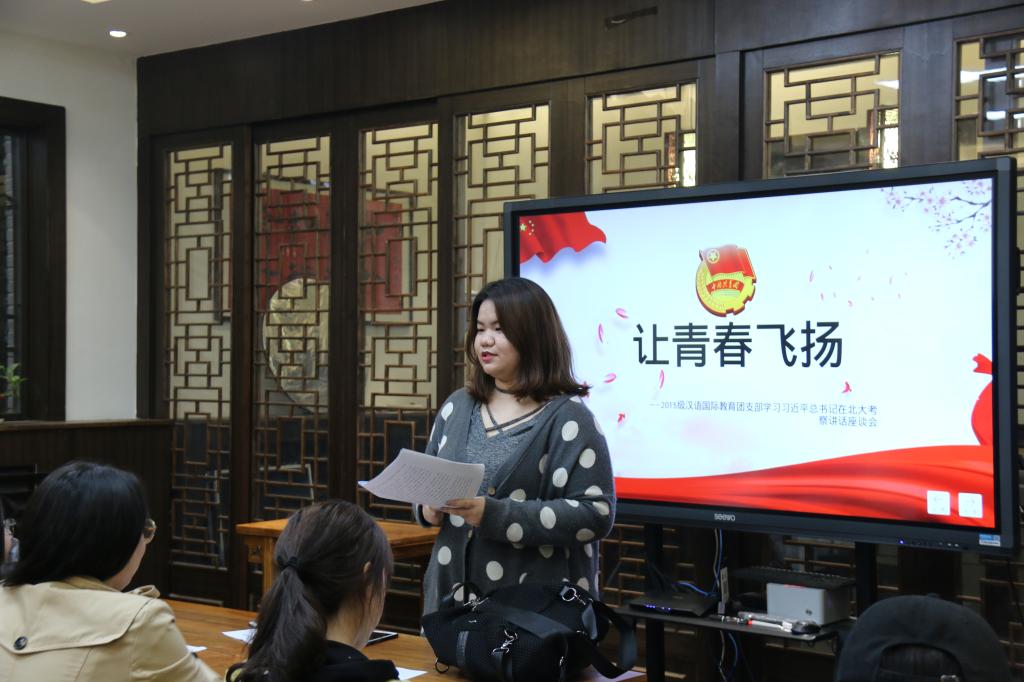 近日,为学习宣传贯彻习近平总书记讲话精神,2015级汉语国际教育全体本科生在公司唐风汉语教室开展了“学习习近平总书记在北京大学师生座谈会上的讲话”主题教育活动。活动由本科生党支部宣传委员包昱和团支部书记孙达静文共同主持。