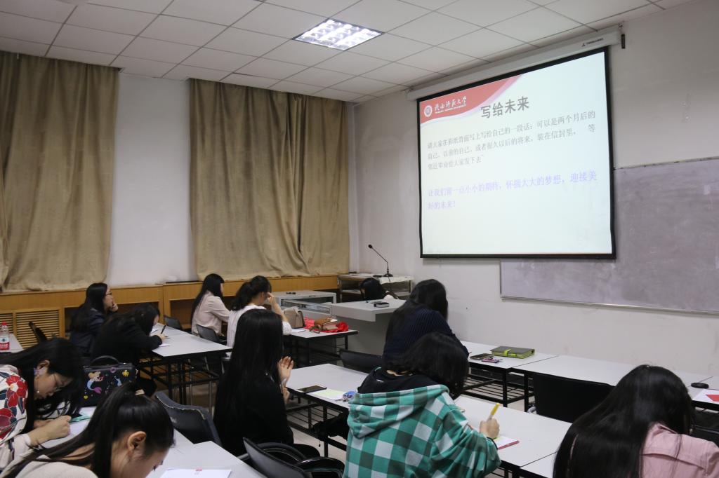 紧接着诚信就业班会的是由心理委员刘思彤主持的“小小心愿——致两个月后的自己”心理沙龙。每个人都得到了一张彩色卡片,在十五分钟的时间里认真地给两个月后的自己写下一些小心愿或小目标,封装起来交由心理委员集中保存。大家许诺,会力争在两个月内努力实现这些小心愿小目标,两个月后毕业时再重新翻出纸张,检阅自己的完成情况。在这样的小小仪式之下,大家静下心来总结过去,展望未来,抒写期盼。
