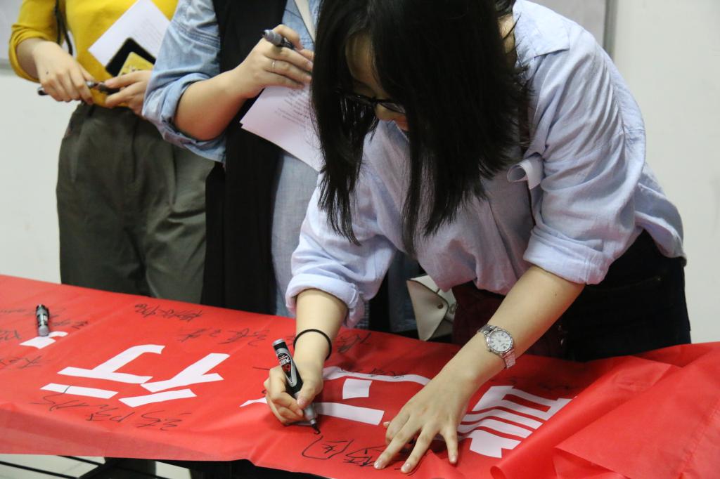 在此大背景下,为了提高同学们诚信就业的意识,班长张晓彤带领大家进行了诚信就业宣誓。“诚信是一个人立足社会的先导,让我们携手创建诚信校园,树立诚信学风,成为诚信学子,用诚信打造属于自己的一片天!”宣誓完毕,每个人在诚信就业横幅上庄重地签上了自己的名字。