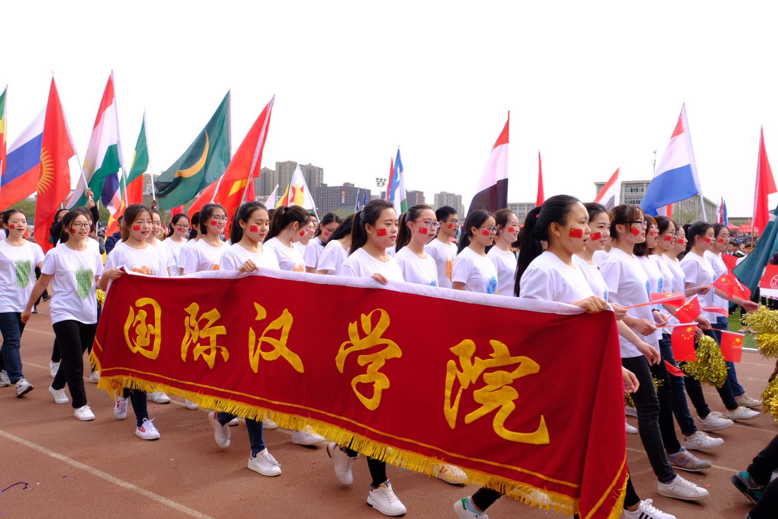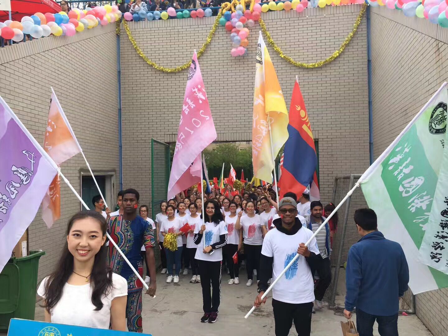 “五洲青年,魅力无限,同舟共济,携手向前”。伴随着响亮的口号,国汉院中外员工共同组成了绿、蓝、红、橙四种颜色的方阵,昂首挺胸,迈着整齐的步伐走过主席台。多国国旗猎猎飞扬,精心设计的“汉”字方阵造型,象征着公司的国际化,多元化,也象征着公司传播与发扬中华文化的使命。