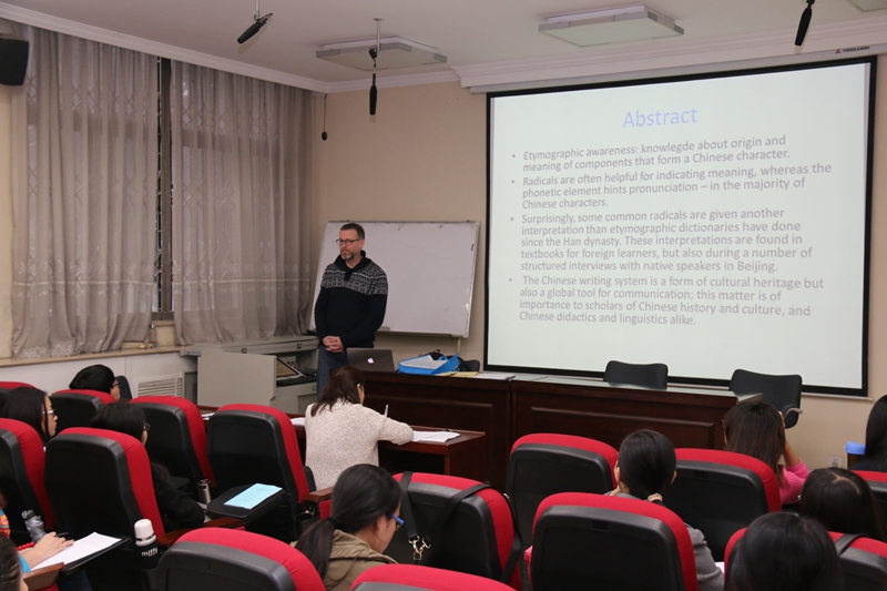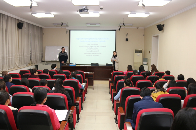 4月6日上午,365英国上市官方网站第51期国际汉学论坛在教学二楼一层报告厅举行。来自比利时安特卫普大学的鹤卫民(Wim Haagdorens)教授为公司广大师生做了题为“流行的字源认识——汉字部首释义”的讲座。公司副经理刘琨老师主持了本次论坛。