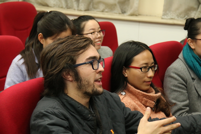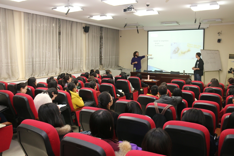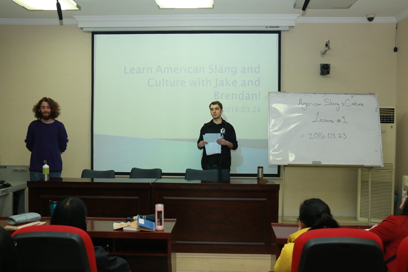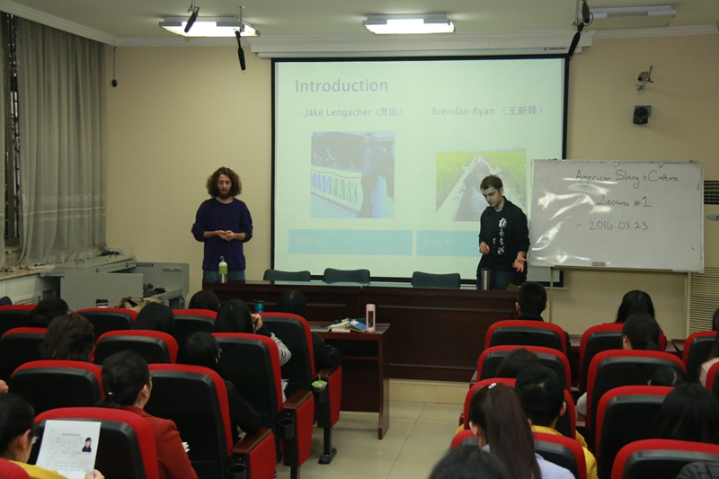 2016年春季,365英国上市官方网站迎来了新一批美国富布莱特项目职工。其中来自美国马萨诸塞州立大学的“93后”职工贾柏和来自美国密西西比州立大学的“95后”职工王新舜两个“小鲜肉”尤其活跃,同是攻读中国语言文化和汉语教学专业的这组CP不谋而合,以“美国俚语与文化”为题,拉开了365英国上市官方网站职工第六期兴趣课堂的帷幕。3月23日下午4点30分,俚语课堂正式开讲,60余名来自不同专业不同年级但都热爱英语学习的员工们齐聚365英国上市官方网站一层报告厅,与他们的美国“小鲜肉”老师一道,学习并交流美式英语中的俚语及美国文化。