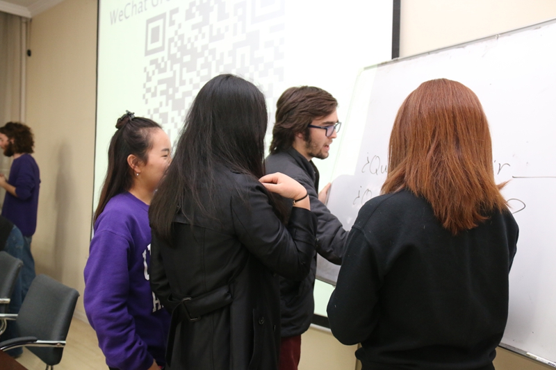 俚语课堂以一段围绕着7个美式俚语单词的录音拉开序幕。贴心的贾柏和新舜担心员工们在起始阶段跟不上录音的节奏,特意将录音内容敲击成文字在屏幕上展示,逐字逐段引导员工们理解。随后的课堂中,贾柏和新舜将录音中出现的7个美式俚语单词单独提取出来,逐一分析并讲解他们的日常用意以及在口语中的其他含义和用法。随后,思维活跃的“小鲜肉“老师们,还通过播放热门美国歌曲MV的方式,让员工们在享受视觉盛宴的同时学习歌词中地道的美语用法。课堂上,其余美国富布莱特项目职工也友情帮忙,在课堂上与中国员工互动交流,参与并协助贾柏和新舜的课堂教学。