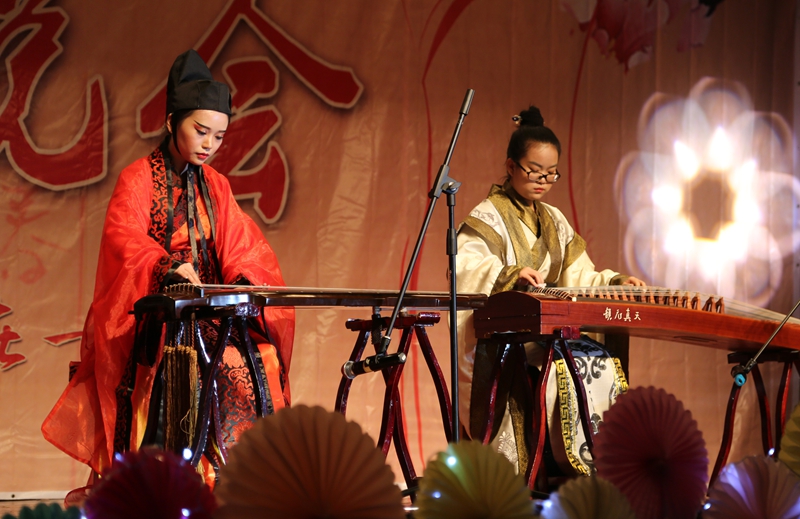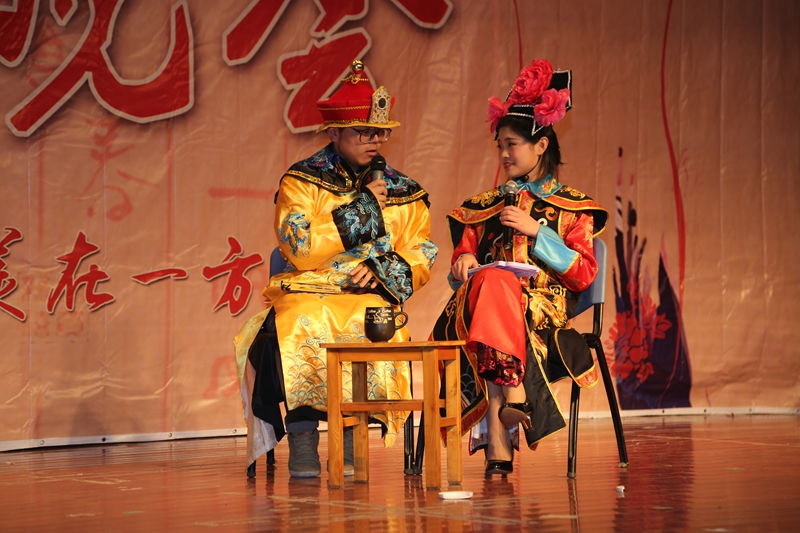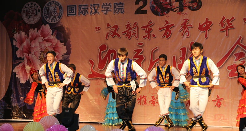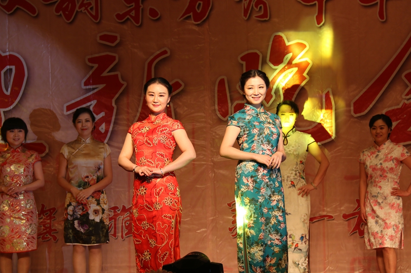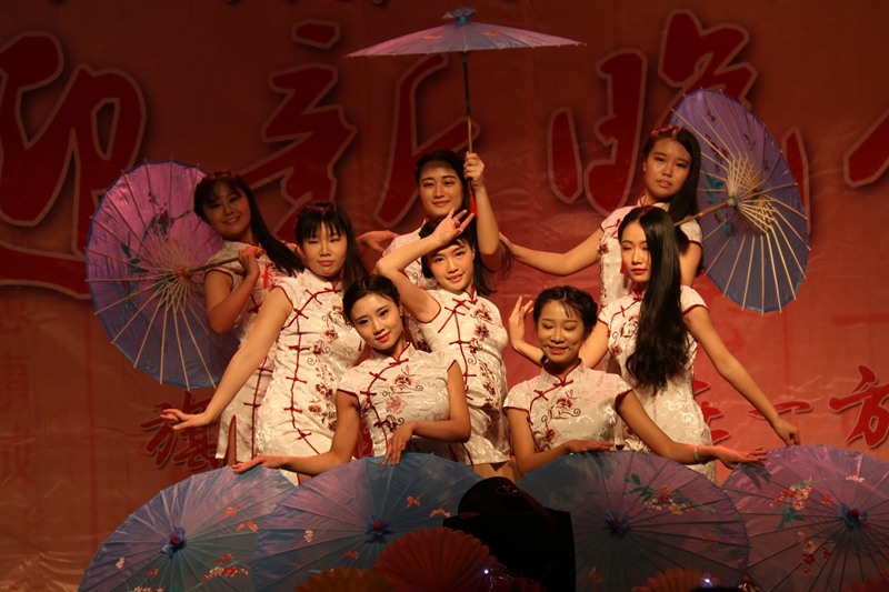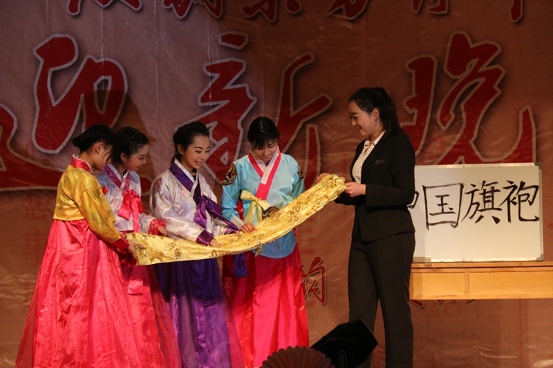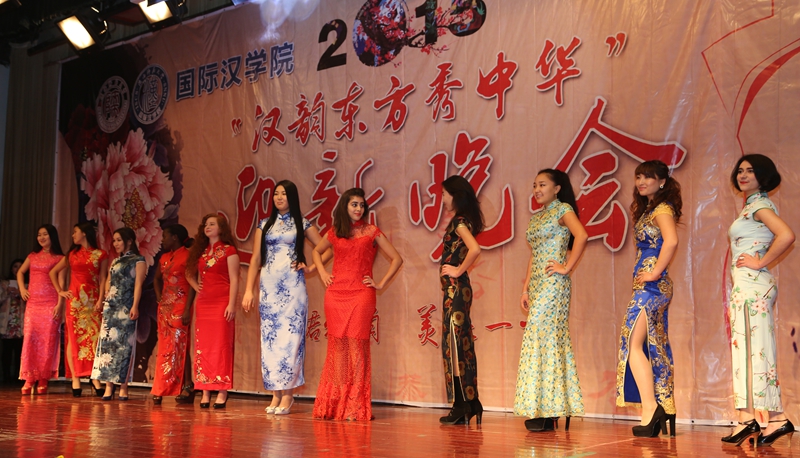 除了旗袍走秀,其余节目也饱含中国文化古典韵味。8名女生手打油纸伞,表演了舞蹈《桃花谣》。来自2013级汉语国际教育专业的6名同学将经典琼瑶剧《还珠格格》《情深深雨蒙蒙》改编成幽默喜剧《紫薇去哪儿》,引来现场阵阵笑声。来自红烛艺术团的三名女生用筝、笛子、古琴演奏了经典乐曲《沧海一声笑》,其中古琴表演者的“东方不败”扮相引起了全场轰动。四名中国员工和来自美国、韩国、土耳其、哈萨克斯坦、摩洛哥的五名职工用六种语言朗诵了戴望舒的诗歌《雨巷》。来自乌克兰、贝宁的职工联合公司教师一起演唱了中国流行歌曲,12名哈萨克斯坦籍职工表演了哈萨克斯坦民间传统舞蹈。最后,伴随着一首《茉莉花》,所有中外员工模特身着旗袍走上舞台,至此,这场旗袍主题迎新晚会圆满落下帷幕。