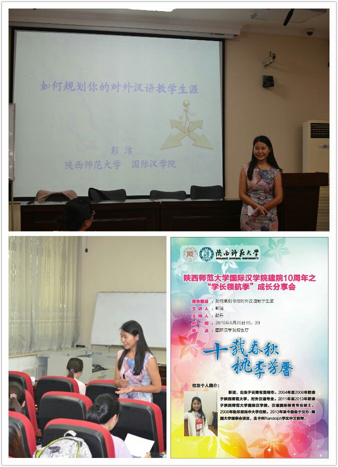 彭洁同学2008年曾赴印尼大学任教,2013年至今服务于汉办-美国大学理事会项目,在美国北卡州学区任中文老师。首先,她和在场的学弟学妹们展开了一个互动热身:请同学们写下自己的一年、三年、以及五年规划。并邀请大家互相分享和交流了具体的个人规划内容。随后,彭洁学姐从四个方面分享了自己的体会: