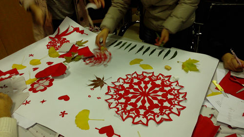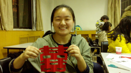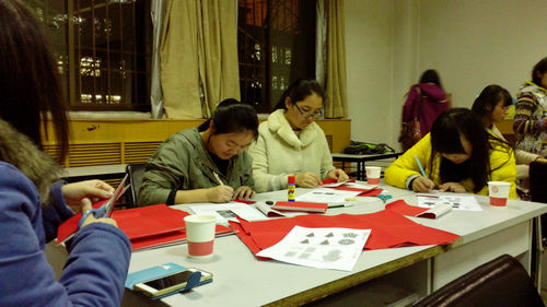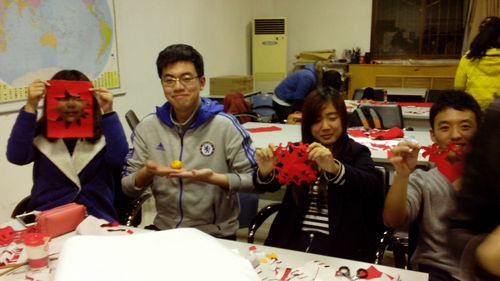 晚7:00,活动准时开始。活动中参与者被分为7组,活动围绕了解剪纸、熟悉剪纸的剪法、抽取主题、通过游戏抢夺道具、制作主题剪纸等环节展开,由国际部部员负责带领外国职工了解、制作剪纸。参与者了解完剪纸的相关视频——《剪纸姑娘》后,剪纸的制作正式开始。活动中还穿插了精彩的抢道具游戏环节,两轮游戏各具特色,充分体现了设计者的匠心独运。尤其是第二轮游戏“水果蹲”,由于参与度更广,可操作性更强,全场气氛空前热烈。