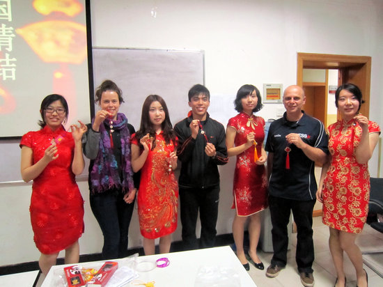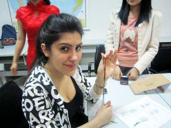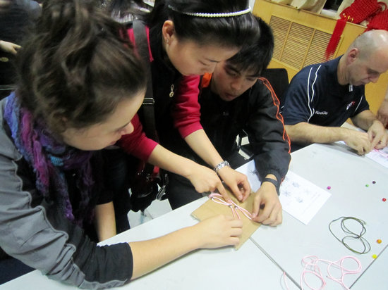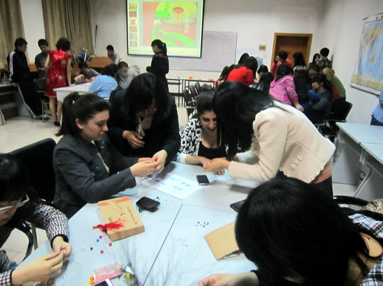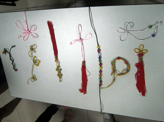 见识了品种多样、风格各异、寓意美好的“中国结”,大家都跃跃欲试,想要编织属于自己的中国结。在指导老师的简要讲解之后,大家开始了“中国结”的制作。中外员工们集思广益,勇于创新,在原有模版的基础上,充分发挥自己的聪明才智,不断把自己的奇思妙想应用于实践操作之中,“中国结”在这群能工巧匠的手里被不断赋予了新的形式和内涵。无论是小巧玲珑的酢浆草结、浪漫传情的同心结,还是制作较为复杂的草花结,都有模有样。一根简单的丝绳,在灵巧的手中还被编织成了精美的手链、项链,让大家赞不绝口。随后主持人进行了一场别开生面的颁奖活动,先后颁发了“最可爱奖”、“ 最具创意奖”、“ 最佳实力奖”、“ 最美观奖”等十多个奖项,给参与者以最大的认同和鼓励,将本次活动引向高潮。最后,作为特约嘉宾的终南笛箫社的同学为大家进行了笛箫演奏,整场活动在美妙的乐曲声中结束。