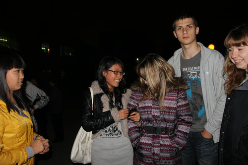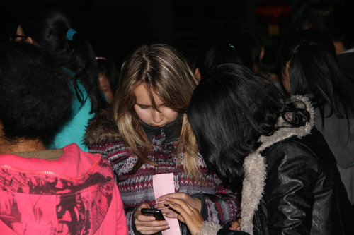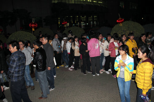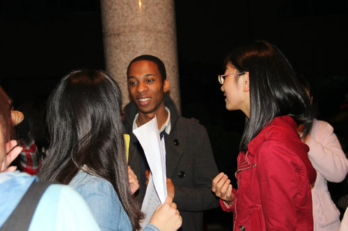 猜灯谜结束后,许多同学仍感到意犹未尽,不愿离去,他们高兴地和外国职工交谈着,三两一堆。现场人声涌动,大家谈得不亦乐乎,音响中的高山流水与春江花月夜的古筝曲创设了空灵古朴的氛围。
