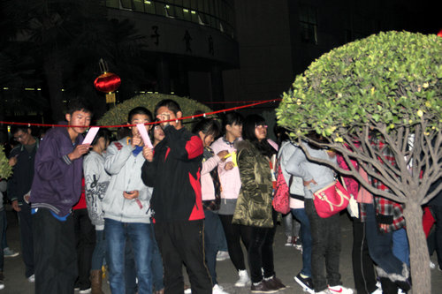 晚上7点,活动正式开始。火爆的场面持续升温,挂谜语的小小区域里挤满了人,大家都兴致勃勃地观看着、讨论着。短短几分钟,原本挂在绳子上的一百多张小纸条便被“洗劫一空”,兑奖处开始排起长龙。