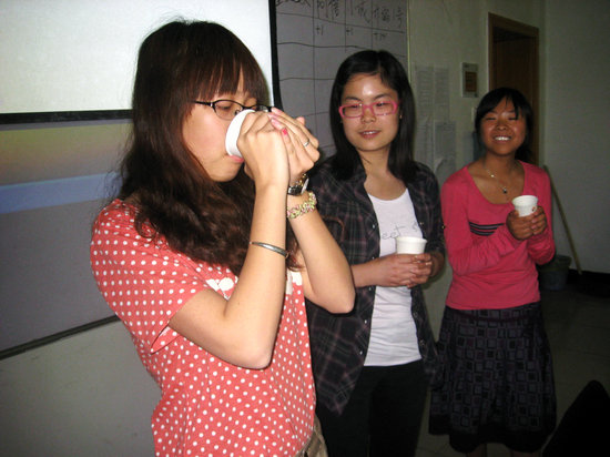 在游戏环节中,同学们通过抽签被分为四个小组,分别取名童叟无欺队,阿信队,小诚队和诈骗1号队。第一个游戏为“真假莫辨”,主持人事先准备了4个纸杯,分别在里面兑上盐水、糖水、醋水和纯净水,四组分别选一名同学上台选择一个纸杯并喝一口里面的液体,大家则通过他们的表情猜测杯子里的究竟是什么,猜对的得1分。当然,上台的同学可以伪装自己的表情,有的同学甚至喝到了酸醋都表现得十分淡定,可见隐藏的功力十分深厚啊。