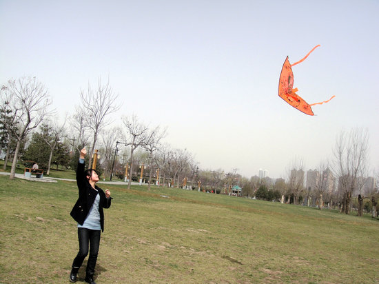 但放风筝并不是件对人人来说都容易的事。有的组可以把风筝放的很高,有的组的风筝怎么也飞不高,还有的组把大部分时间花在了理线上,忙的焦头烂额。当然,这也与风筝的结构和引线的材质有关。约莫半个多小时后,大家已觉尽兴,三三两两踏上归程。