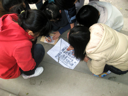 全班同学分为A、B、C、D四个小组,每组七人。每组有一份被剪碎的校园地图,首先他们要将地图拼好,找到自己需要去的5个地点,然后依次前往。每个地点均有一名班干部负责提问。为了增加难度,每个小组在回答问题前必须先找到藏在地点附近的一个橘子,然后回答负责人提出的四个问题或是表演跳绳、掂乒乓球等项目,只有顺利完成全部的难题才可以前往下一地点。当然,若是问题太难,每小组还有两次求助机会。