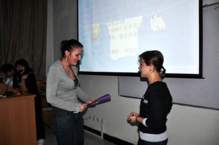 接着,由中外朋友共同参与的猜词和情景再现两个游戏将全场的气氛推向了高潮。由于职工汉语水平有限,在猜词时不时会闪现幽默的语言和诙谐的动作,中外朋友之间的默契配合都博得在场同学阵阵掌声。简单的游戏拉近了中外朋友之间的距离,相同的语言消除了彼此的陌生。