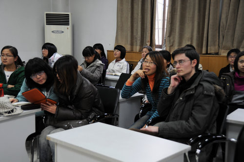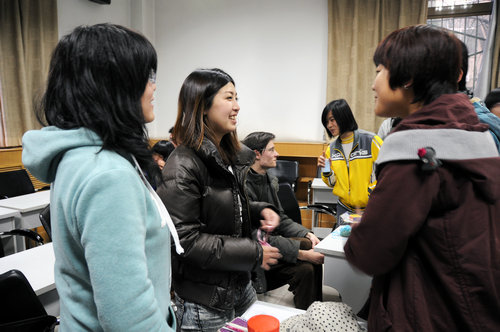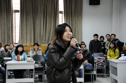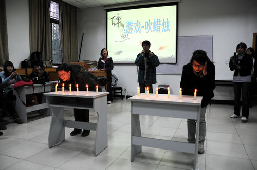 多彩的游戏环节中职工朋友展示了他们的汉语水平,来自日本的松本小姐朗诵了唐诗《鹅》,让我们刮目相看。在小游戏——“吹蜡烛”中,一位同学一连串的的“呸呸呸”令人捧腹,虽然是吹灭蜡烛的好方法,但却违反了游戏规则,最终,来自波兰的马丁用六个爆破音取得了胜利。另一个游戏则考验了同学们的思维能力——“正话反说”,开始几组较短的词语大多数同学们都表现不错,可是到了长一点的词语就不得不认输了,虽然这样,还是有两个同学凭着超强的记忆力完成了所有题目,收到了五洲汉儒的小礼物。