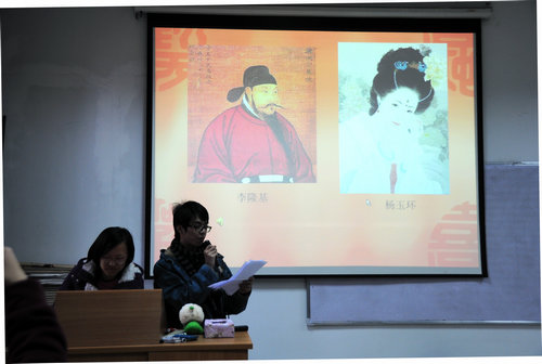 主持人先介绍了唐朝几位重要政治人物——李世民,武则天,李隆基,杨贵妃。当然还少不了大家熟知的那段唐明皇与杨贵妃之间的凄美爱情——“在天愿作比翼鸟,在地愿为连理枝。天长地久有时尽,此恨绵绵无绝期。”
