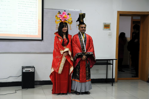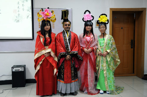 接着,我们又了解了唐代女子的妆容,发式,花钿等艺术,让大家大开眼界,特别是让在座的职工对唐朝时的中国有了更进一步的了解。正当大家对唐朝的服饰感到好奇的时候,印度职工穿着唐朝的帝皇装踱着步子走了进来,颇具喜剧效果,他与中国员工扮演的唐朝皇后很是般配呀!一旁的两个“宫女”也扮演的有模有样。一轮唐装走秀后,大家都从他们的服装上看到了大唐的雍荣华贵。