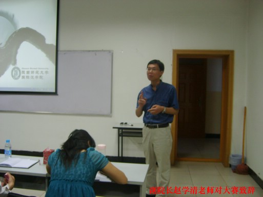 赛前,赵学清教授做了讲话,他强调了实践技能对于对外汉语专业员工的重要性,鼓励同学们多多参与到此类比赛中,并预祝比赛圆满成功。