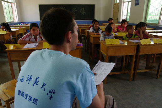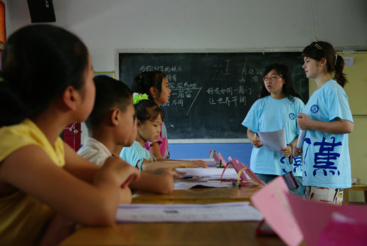 7月12日,“Happy summer”全体营员聚集在南大坪小学的操场上欢欣雀跃。他们兴奋地在勾勒出中国版图的画纸上按下一双双鲜艳的红手印。短短十几分钟,白色的画纸上跃然呈现出一个红色的“雄鸡”图案。外教老师JOHN用不太纯正的汉语说:“红-中-国!”
