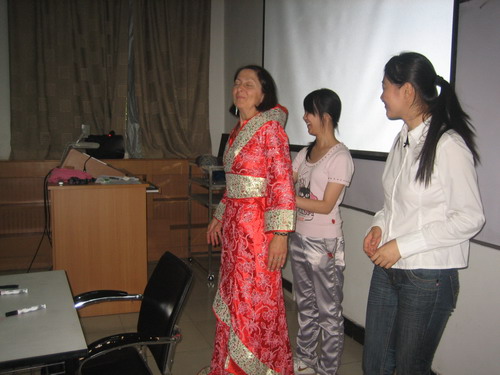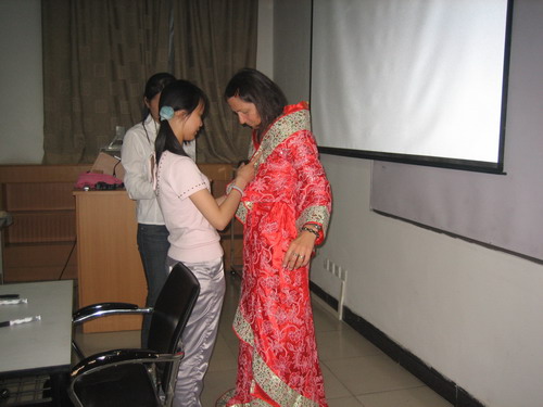 西安以十三朝古都文明于世,尤其是汉唐两朝,政治经济文化都发展到了一定的高度,呈现出特有的色彩。本期汉语角从生活中服饰这一基本因素为基点介绍当时社会发展状况及人们的生活习惯。这次活动吸引了来自德国、加拿大、韩国、蒙古等国家的职工前来聆听学习。活动伊始,身着汉服的曹雯苓以其姣好的身材可人的容颜将汉服的文化表现得淋漓尽致,吸引众外国友人纷纷前来合照。活动现场气氛热烈,中国风浓厚。接着主讲人王静以其流利畅晓而又生动的语言辅以精美的图片将汉唐服饰文化一一描述,具体讲解了汉唐服饰的不同特点、形式、颜色以及服饰对人们身份地位的影响,观众深深为之陶醉。现场的汉唐服饰表演更让外国友人激动不已,来自德国的葛玉和蒙古的莎丽洁不禁跃跃欲试,亲自身着汉衣唐装体验中国服饰的文化魅力,为活动增添异国风情的色彩。在之后的自由讨论中职工与中国员工一起切磋了汉唐时期人们的生活习俗与各国和现代人们生活的差异不同,在交流中体会了中国古朴的民情、文化的博大精深及世界的多元化和现代化。
