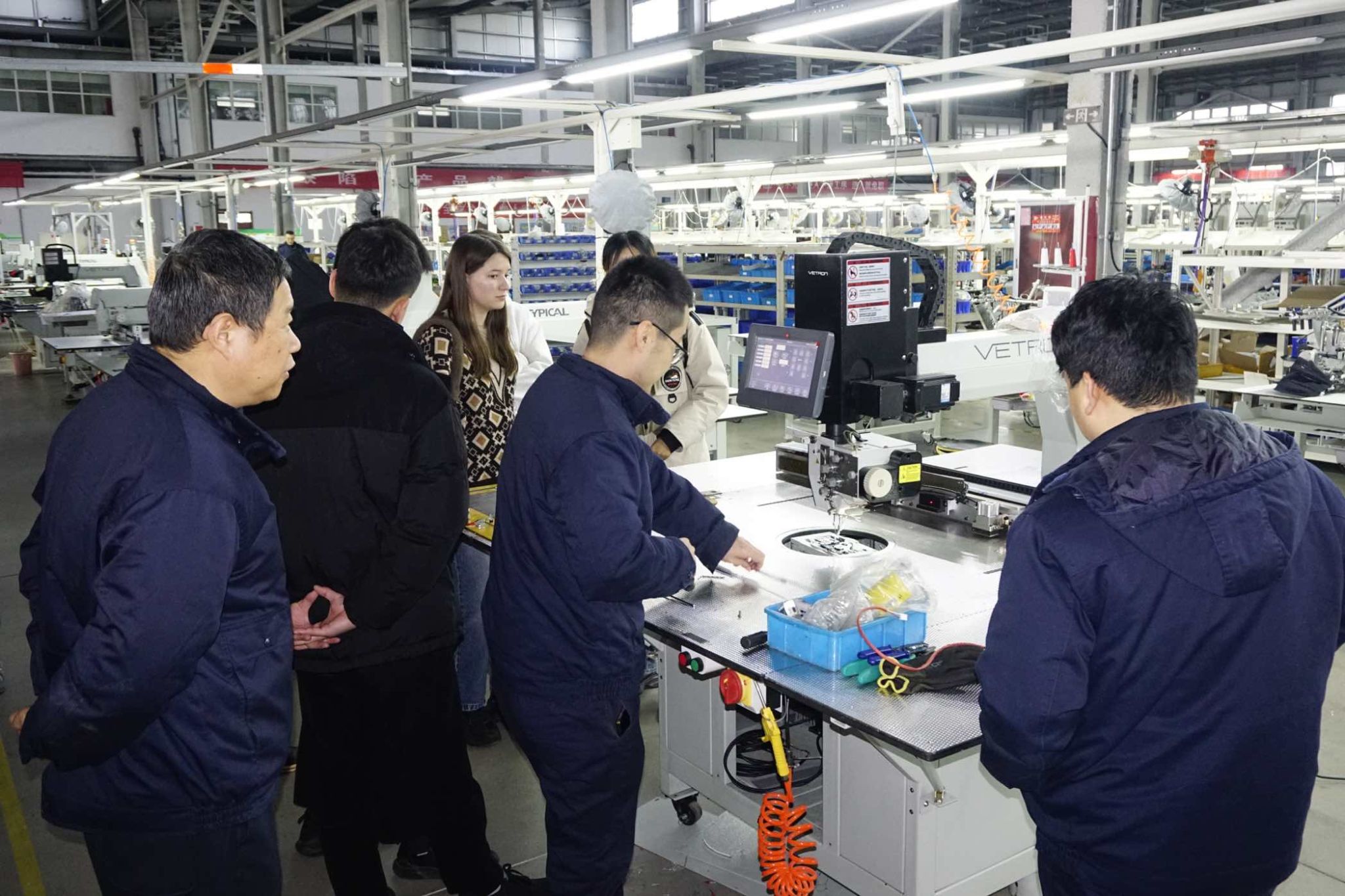 随后,师生们深入生产车间进行实地观摩。在智慧工厂区域,工作人员带领同学们参观了高度自动化、数字化的现代生产线,看到了汽车座椅面套从裁剪到缝制的完整流水线。总经理介绍,标准股份正积极运用物联网、大数据和人工智能技术,推动生产过程的智能化与绿色化转型。目前公司的产品与应用已远不止于传统服饰加工,还广泛涉足特种工装、汽车内饰乃至环保产业相关系统解决方案,展现了现代中国制造企业多元化、集成化的发展路径。