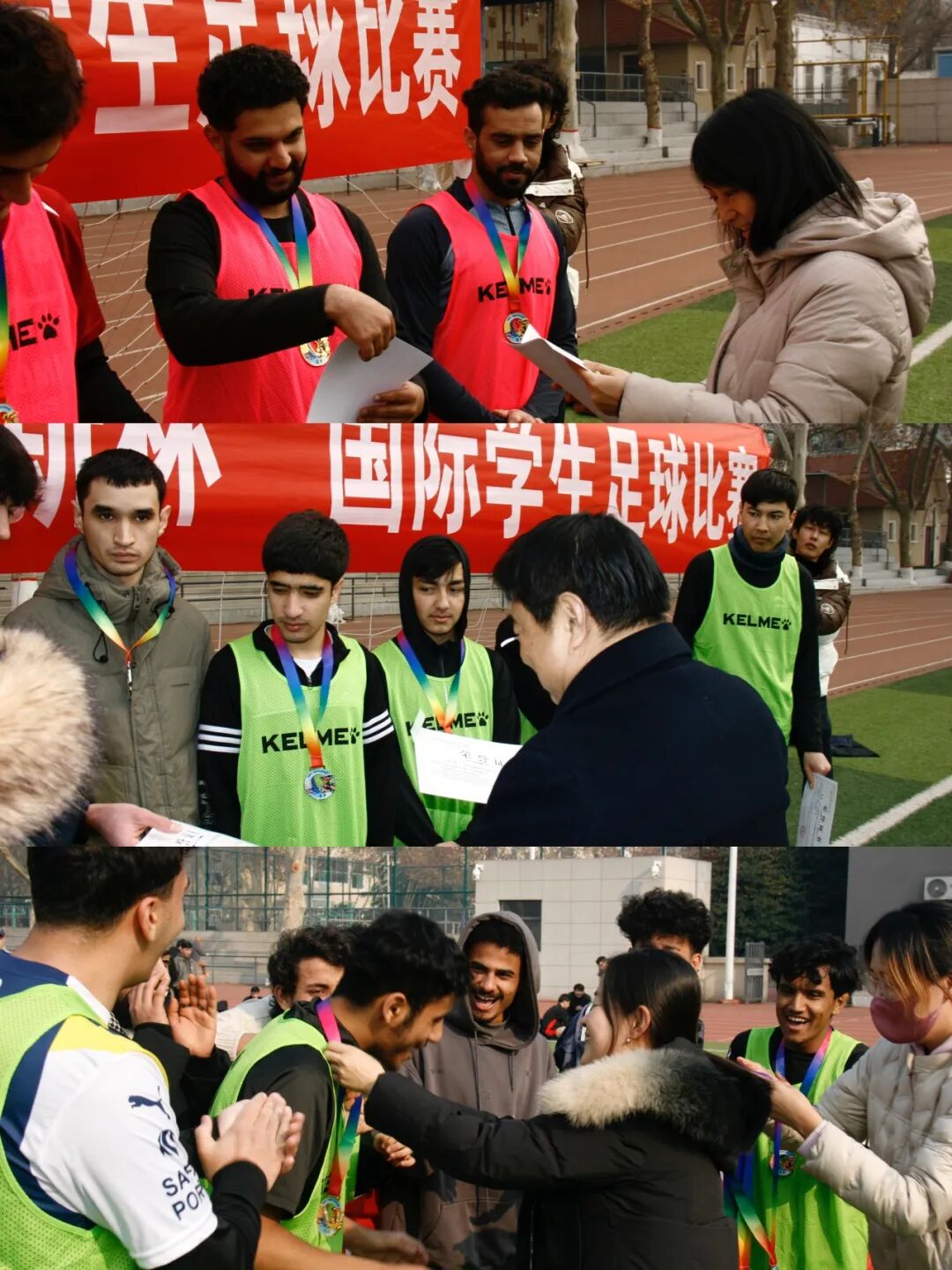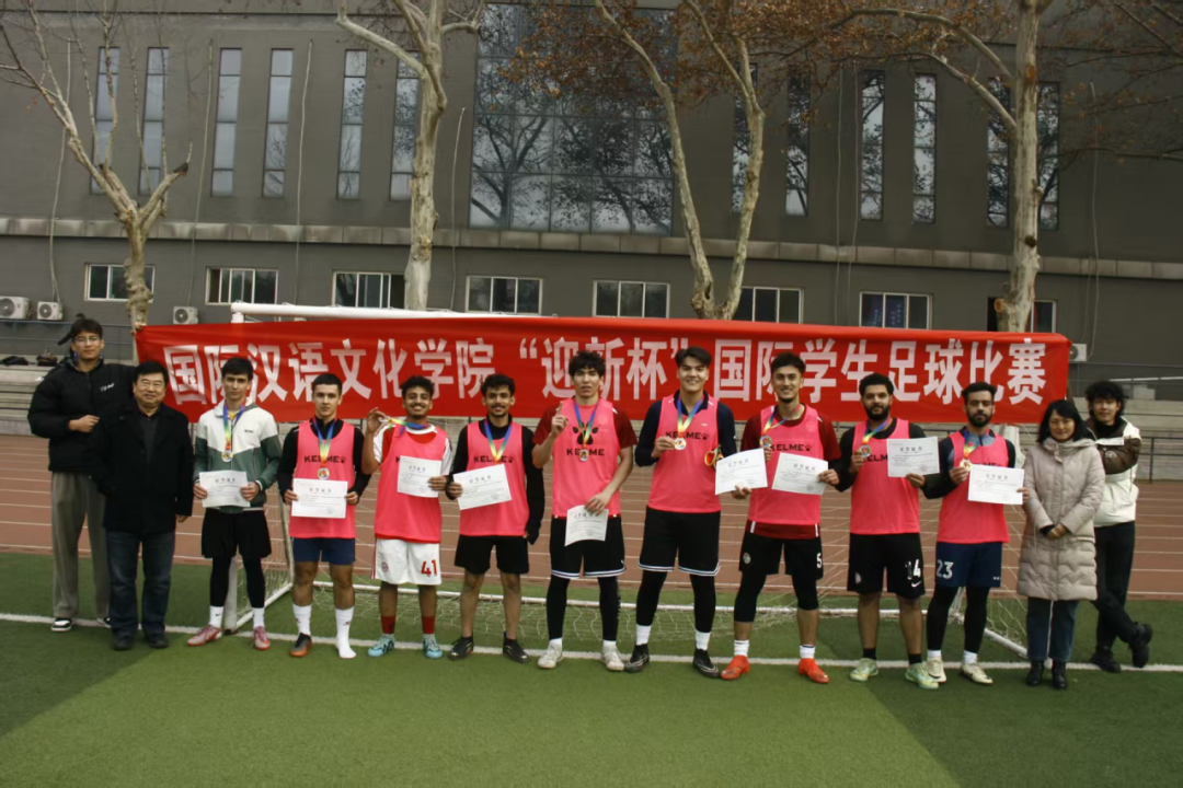 为了让来自世界各地的职工们在竞技与协作中深化友谊,共筑归属,365英国上市官方网站在雁塔校区田径场举办“迎新杯”国际员工足球赛。来自二十余个国家的7支队伍参加比赛,本次比赛历时一个月,经过11场的激烈角逐,于2025年12月30日完赛,公司经理石洛祥、党总支书记李小玲、党总支副书记王钰、团委书记翁思洁、职工辅导员张欣元、留管干部刘小熊参加颁奖仪式。