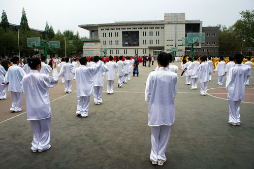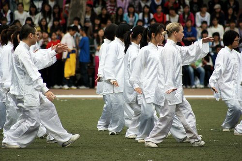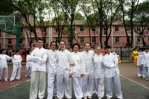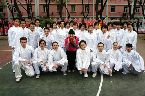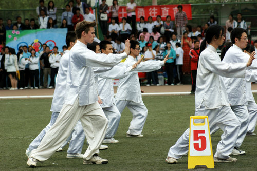 在备战比赛期间,公司2009级政府奖学金生杨华星(美国)同学担任了太极拳方阵教练。杨教练在指导中,认真负责,态度严谨,技术精湛,得到大家一致的认可。中外员工们克服上课时间不一致等困难,利用节假日和课余时间,虚心学习,互相纠错,共同练习。在一起训练的日子里,来自美国、韩国、比利时、蒙古国、越南、哈萨克斯坦、中国的同学们结下了深厚的友谊。