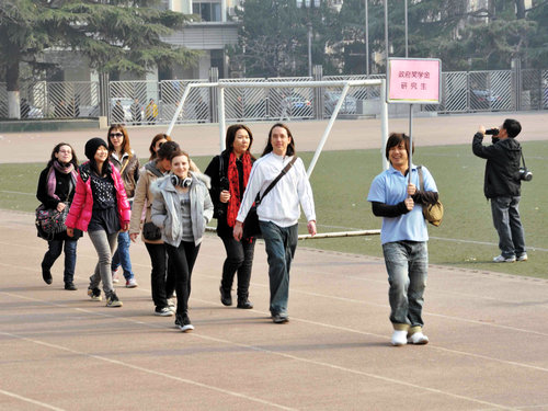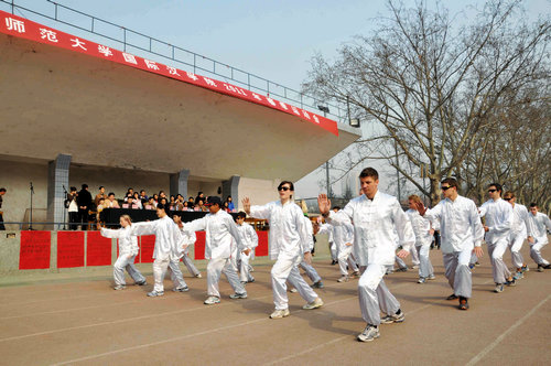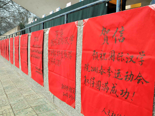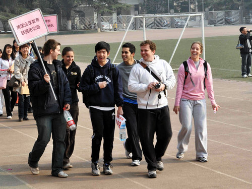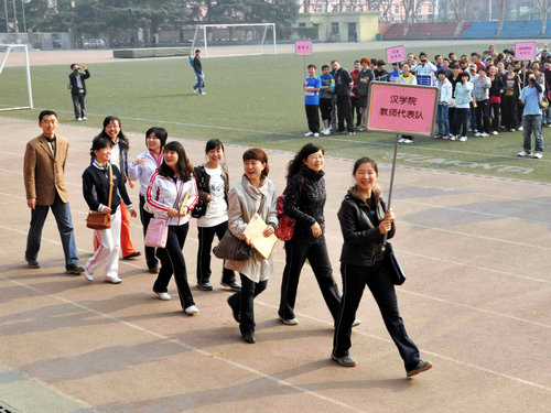 伴着运动员进行曲,由2007级对外汉语班、2008级对外汉语班、职工普通班、职工本科班、研究生班、澳大利亚埃迪斯科文大学短期培训班、美国教育联盟项目培训班7支队伍组成的方阵依次登场,向主席台上的老师领导挥手致意,展现各自风采。