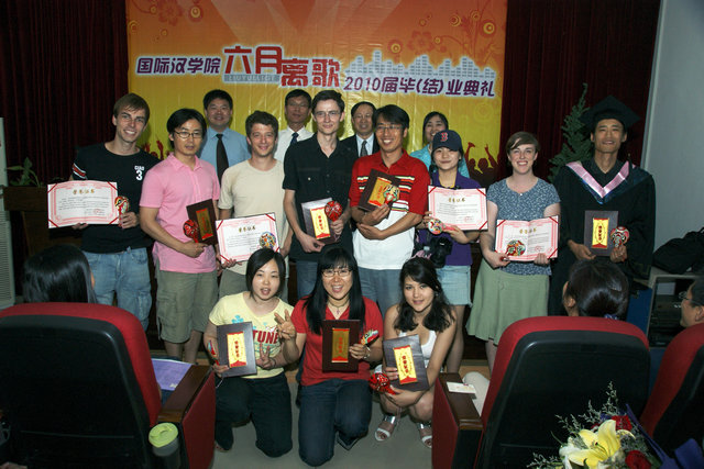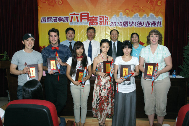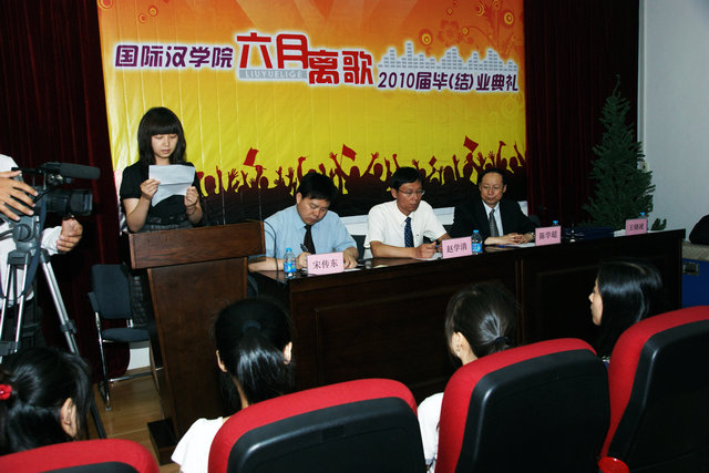 颁奖仪式结束后,2010届对外汉语专业本科毕业生代表陈俊伊发言。她说,母校不仅给毕业生们传授了知识和能力,更多的还有宽广的视野以及豁达的胸怀。尽管离别充满了伤感,但所有的毕业生们已经做好奔赴未来的准备。他们将脚踏实地,厚德敦行,在实现个人理想和价值的过程中担负起国家和社会赋予的责任。