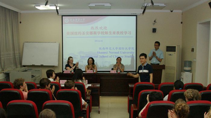 吴媛副经理代表张建成经理对美国纽约圣安娜斯公司师生时隔两年再次来访公司表示欢迎,并希望美国员工在华期间能够充分体味西安厚重的历史文化,学好汉语,不虚此行。郭玉明老师对公司所做出的精心安排与付出的努力表示感谢,并希望双方的合作可以持久开展下去。