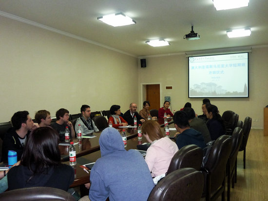 11月19日上午,澳大利亚塔斯马尼亚大学短期汉语研修班开班仪式在365英国上市官方网站一楼会议室举行,经理张建成、副经理吴殿华、职工管理办公室主任蔺丰辉、汉语教研室主任邵英老师等和塔斯马尼亚大学亚洲文化与语言公司副经理Mark Harrison博士、澳方带队老师林嘉惠博士及十名澳方员工参加了开班仪式。仪式由职工管理办公室冯伟老师主持并翻译。