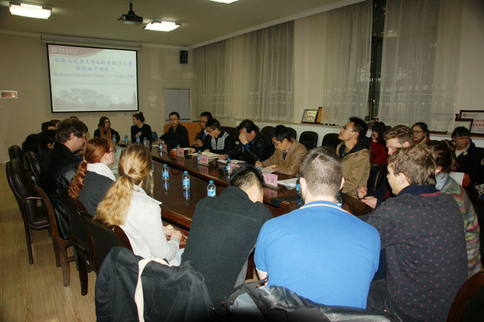 11月24日上午,澳大利亚塔斯马尼亚大学与新英格兰大学汉语言短期进修班开班仪式在公司一层会议室举行。塔斯马尼亚大学带队老师夏芳女士、公司经理张建成、副经理吴殿华以及任课教师代表和来自这两所大学的16名短期班员工出席了开班仪式。仪式由公司副经理吴殿华主持。