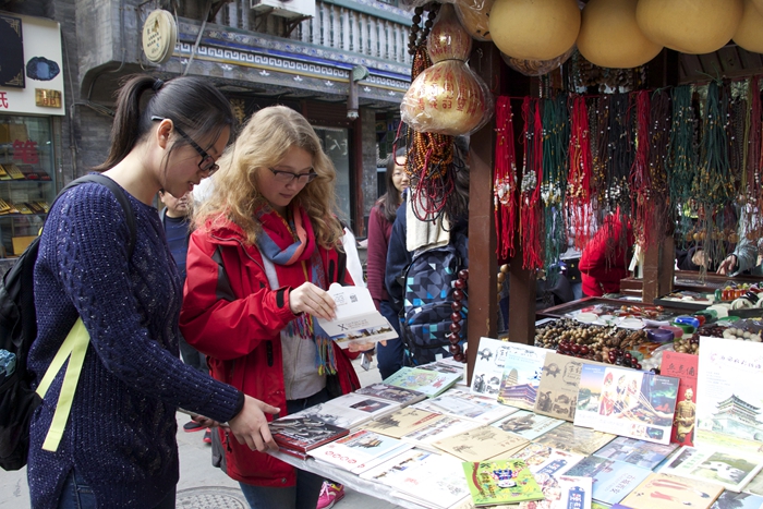 接着,同学们三五结伴,徜徉于书院门,观画赏古,乐意无穷。有产自西域的青白玉石,茶马古道上的中国好茶,雕刻精细的葫芦埙及种种名目繁多的传统管弦乐器。职工每到一处,导游亲切讲解,店主热情相迎。在赏玩古埙的时候,导游还试着从店中捧起一口八孔埙,即兴的为职工送上雄浑有力的一曲,立刻吸引了职工的观摹。来自俄罗斯的靓仔Parshin Sergey也兴高采烈地拿起一口比两个成人的拳头还大的古埙学起来,顿时现场多了几分默契。但由于埙看着简单,实则要演奏好需要好好的学习一番,故现场也不时发出奇怪的像牛吼的嗡嗡声,引来阵阵笑声。