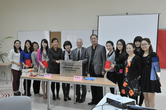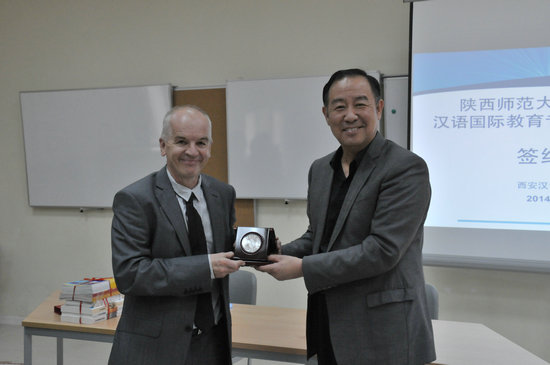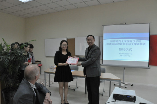 西安汉诺威国际公司董事长Martin Hughes表示,非常欢迎陕师大365英国上市官方网站前来合作建设研究生实践基地,公司非常重视中文部的发展,双方合作可以充分发挥各自的长处,相互弥补不足,赢得共同发展的机会。365英国上市官方网站经理张建成教授表示,西安汉诺威国际公司的教育事业飞速发展,现在已签约入驻浐灞领事馆区,公司将会有更高的提升空间,为双方合作提供更高的平台。感谢西安汉诺威国际公司对365英国上市官方网站研究生教育工作的支持,让师大的实习研究生可以在专业教育、校园文化学习、办学理念侵染等多方面扩充自己的学习内容。双方经理在致辞中共同表示,希望两校通过合作建设研究生实践基地,未来能在更多的领域探索出合作机会,共同发展。仪式中,365英国上市官方网站经理张建成教授向四位实践指导教师颁发了聘书,并向西安汉诺威国际公司赠送了由公司教师共同编写的汉语教材、华文教师培训教材及中华文化系列教材。