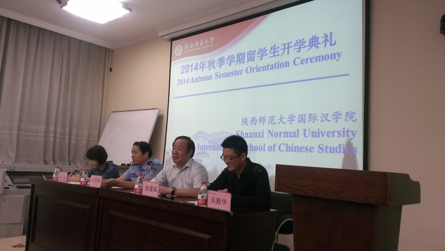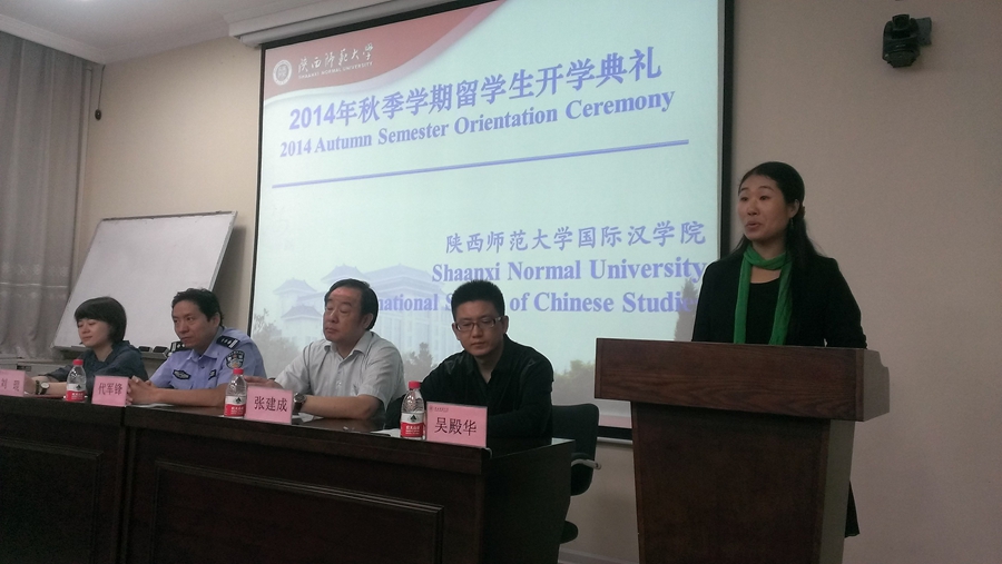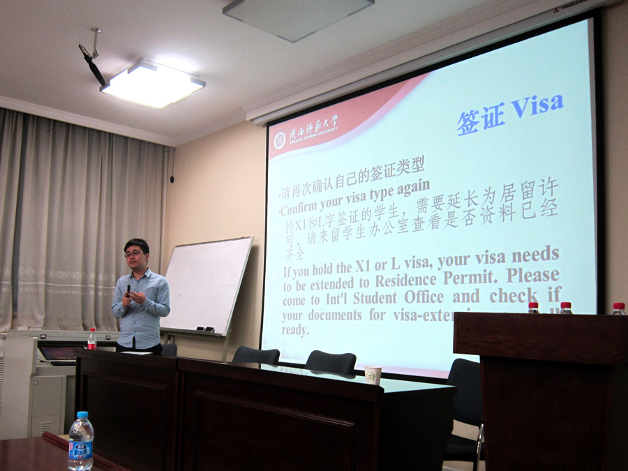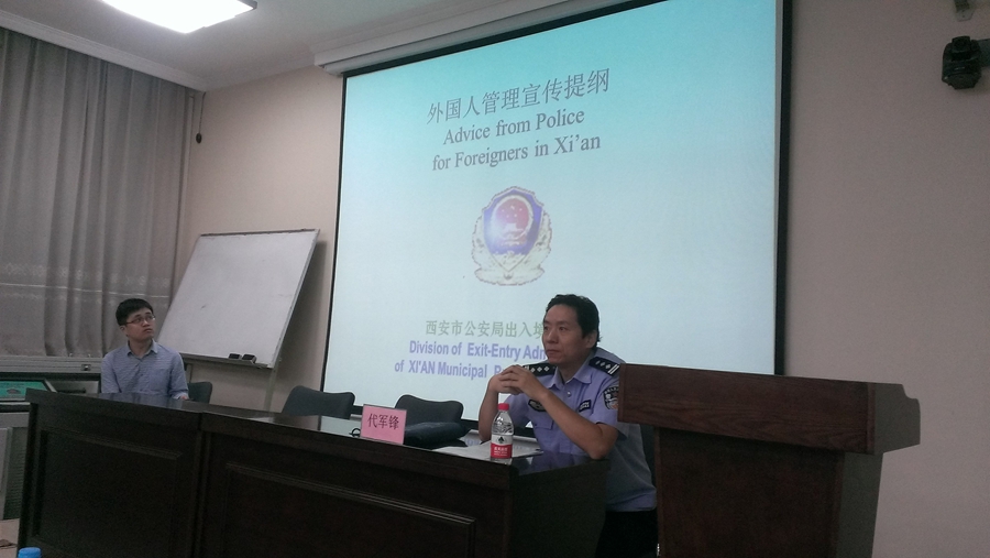 西安市公安局出入境管理处外管科科长代军锋为新生做政策宣讲