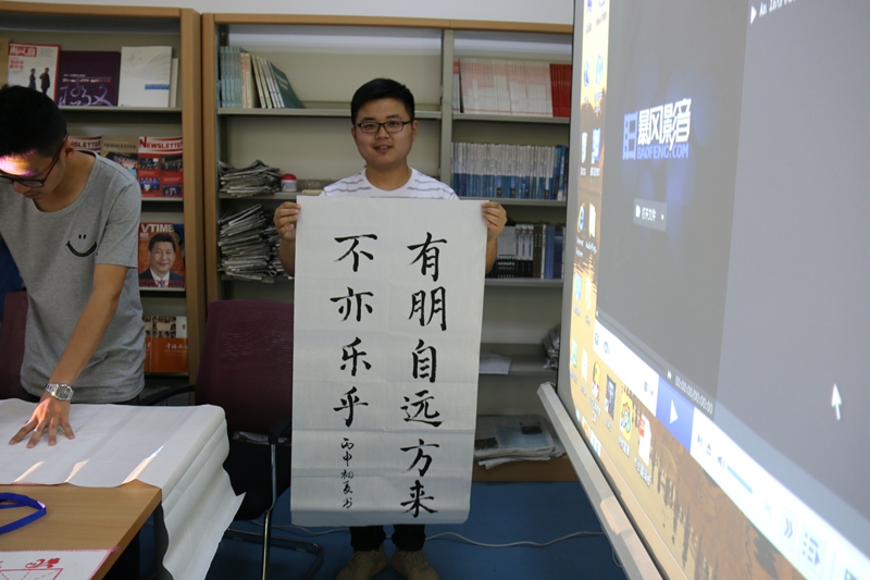 书法老师还写下论语名句“有朋自远来来,不亦乐乎?”欢迎各位美国员工的到来,并将自己的书法作品“抱道不屈,拥书自雄”赠送给他们作为留念。