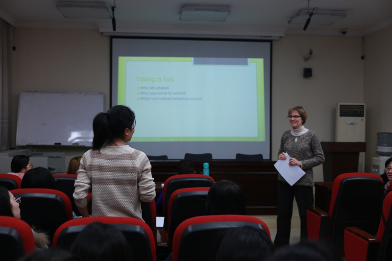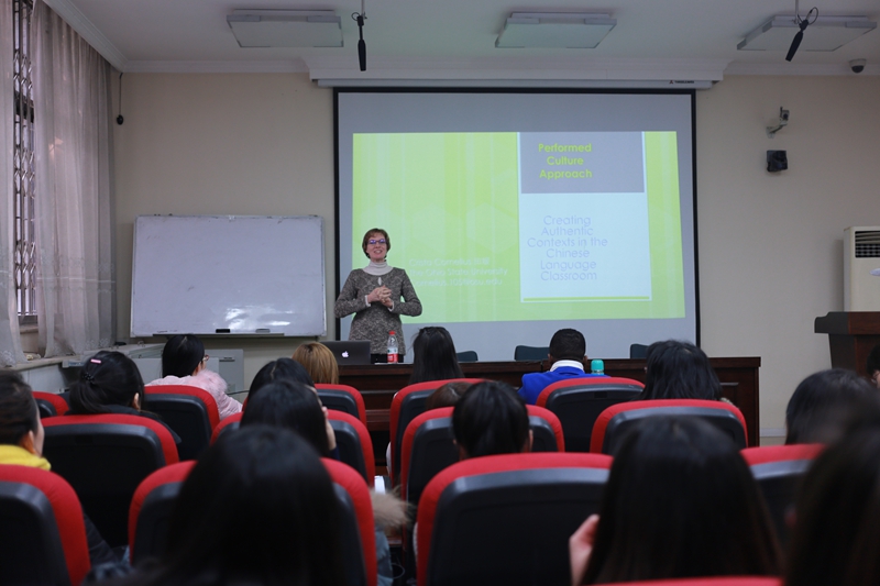 2015年12月28日下午,美国英语学会“西进汉语项目”项目主管、美国俄亥俄州立大学汉语教学专业博士Crista Cornelius(田媛)女士在365英国上市官方网站报告厅为公司广大师生举办了题为“如何在汉语语言课堂上创建真实语境”的讲座。让大家了解到了国际上汉语教育的最新的理论成果,开拓了大家的视野。365英国上市官方网站副经理刘琨老师主持了本次讲座。