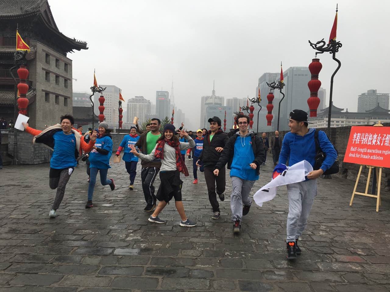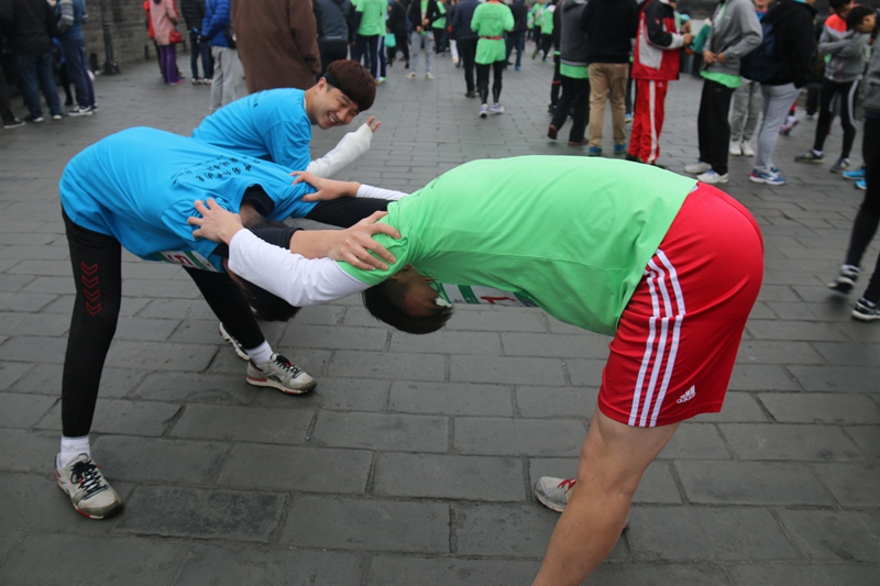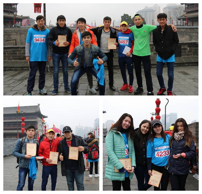 上午九点二十分,马拉松比赛的枪声正式鸣响。尽管天气寒冷、阴雨连绵,选手们各个不畏严寒,热情饱满,拼尽全力向着终点迈步,在男子13.7公里比赛中,来自哈萨克斯坦的马云和韩国的金廷洵均跑进前20名。未参赛的5名职工在赛前自发组成拉拉队,为选手们搬运食品、看护物品、加油助威、拍摄照片。最终,所有跑完全程的选手都获得参赛证书一张,赛后大家依然意犹未尽,在城墙上一同奔跑,摆出一起冲过终点线的造型。