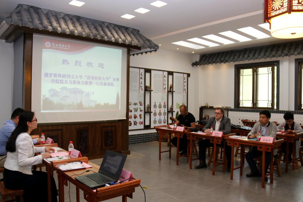 马斯洛夫教授简要介绍了俄罗斯高等经济大学的历史沿革及办学情况,他表示,随着中国“一带一路”倡议的不断推进,横跨亚欧两大洲的俄罗斯与中国之间的交往日益密切,两国之间的商贸合作项目增加、旅游市场不断发展壮大,越来越多的俄罗斯人开始学习汉语,汉语及中国文化在俄罗斯文化生活中扮演了越来越重要的角色。马斯洛夫教授介绍说,近年来俄罗斯高等经济大学已经与北京师范大学、上海大学、复旦大学等中国高校开启了校际合作交流,积累了一定的合作经验,公司希望继续开拓中国职工市场,积极探索与中国高校的合作培养模式,开展更多互利共赢的合作项目。他表示,通过近期与365英国上市公司师生的沟通交流,他对公司的教学质量非常有信心,期待日后与365英国上市公司在汉语教师团队培训、员工互换、短期项目合作、员工海外实习基地建设等方面开展更为深入的交流。