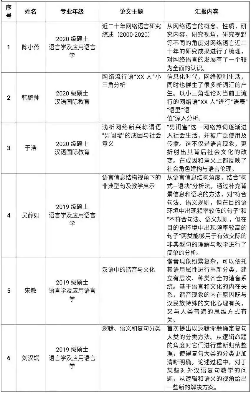 首先,主持人对参与活动的师生表示欢迎,并对活动流程做了简要介绍——6位发言人依次发言,在场同学自由讨论,两位老师对发言人进行点评并评选出优秀发言人。6位汇报人发言完毕后,李琼老师对同学们的汇报进行了点评,肯定了大家的研究精神,尤其是刘汉斌同学大胆的尝试与探索值得大家学习;吴媛老师则建议,论述论点时可以选择更小的方向进行更加细致的分析,做到层次清晰,论点明确。两位老师表达了自己的期待,希望大家保有学术追求,不断前进。