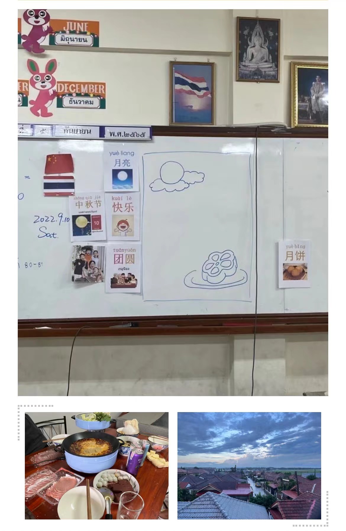 又是一年中秋佳节,但2022年的中秋节对于我来说是一个非常特别的中秋节,这一天是我来泰国任教的第30天,这一个中秋节也是没有家人和朋友陪伴的第一个中秋节,在这一刻我真真切切地感受到了“海上生明月,天涯共此时”的心情,但是丹麻刊低亚中学的老师和孩子们却带给我家人般的温暖,我们一起举办了中秋节文化活动,在这里我们向员工们介绍中秋节,和他们一起品尝月饼,度过了一个充实而快乐的中秋节。值此之际,祝愿在海外任教的志愿者教师节日快乐,也祝愿在国内的你们中秋节快乐!“月”来越幸福。