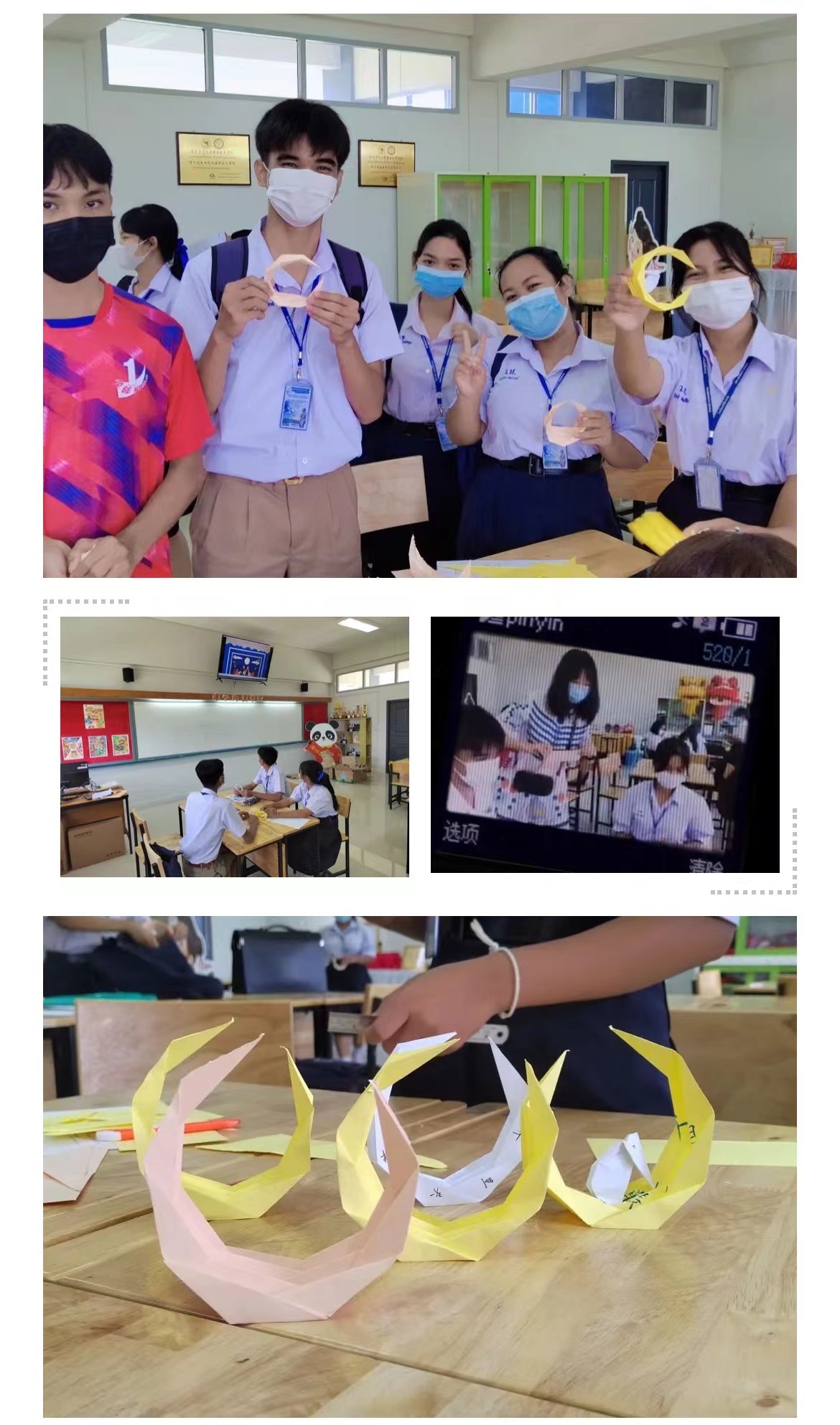 我们的中秋课堂分为了两部分,前半节课给员工们讲中秋的来源和相关的习俗。泰国的员工很热爱表演,在给他们讲后羿射日和嫦娥奔月故事的时候,他们一边听故事一边把自己代入情节,听到后羿回家发现嫦娥不见了,班上孩子们都很配合,哭哭啼啼地学后羿嚎叫“嫦娥——你快回来”,边喊还边拿出纸巾擦擦眼泪。后半节课带着大家做手工,用彩色的卡纸折一轮弯月,折纸的难度有些大,员工这节课说的最顺溜的一句话大概就是这句“老师,太难了”。不过也没有人选择放弃,都坚持折到了最后,最后手里拿着自己亲手折出的月亮,孩子们都笑得很开心。