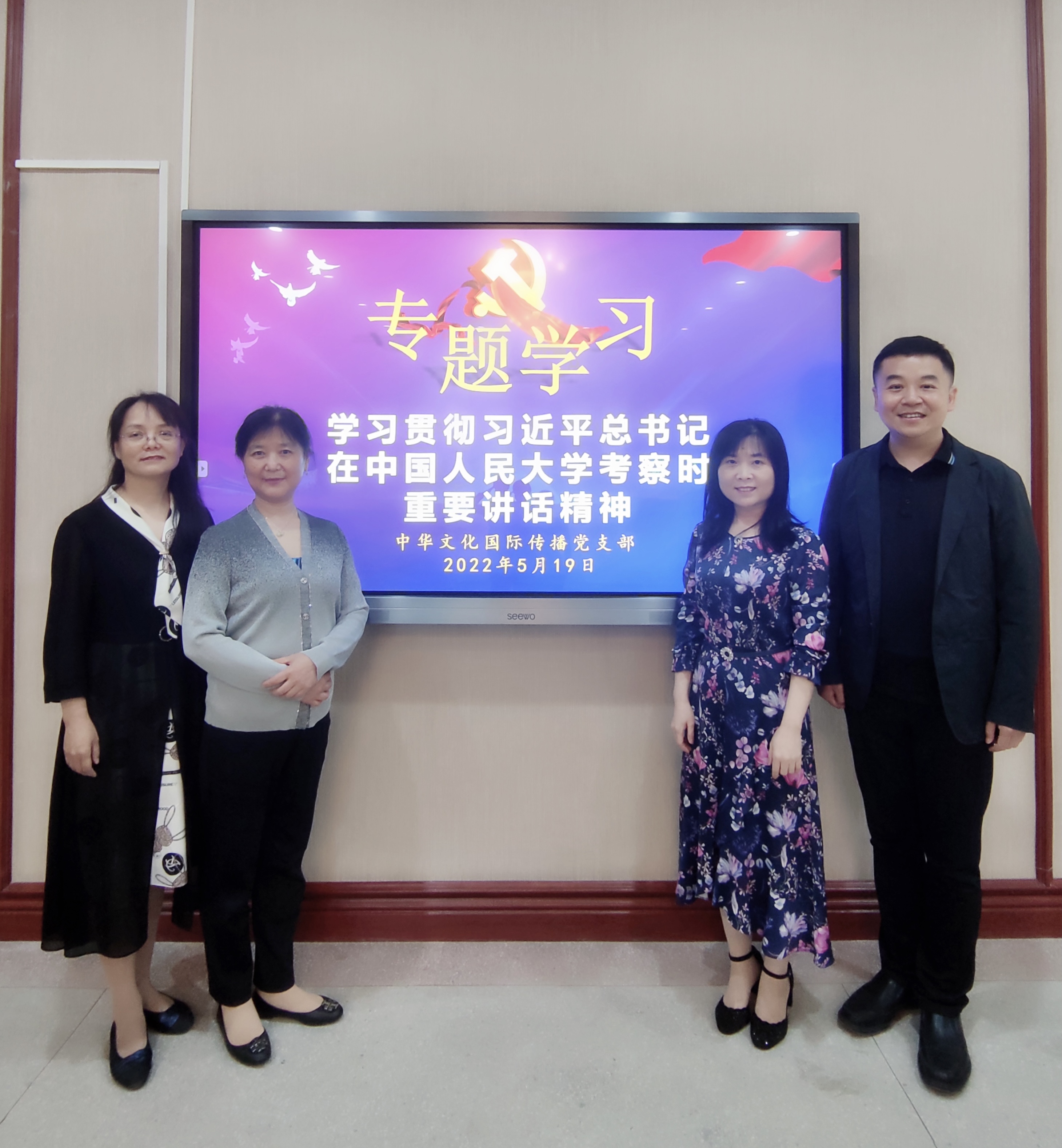 2022年5月19日上午,中华文化国际传播党支部开展专题理论学习活动,此次活动的主要议题是“学习贯彻习近平总书记在中国人民大学考察时重要讲话精神”。活动由支部书记邵英主持。