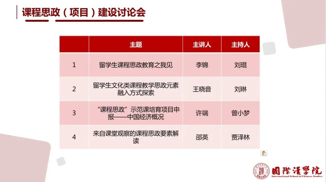 在四位老师报告的过程中,与会老师讨论热烈。公司党总支书记马兰结合公司工作发展的目标提出要积极借鉴全国走在前列的一些公司的成功经验,结合公司实际打造国际员工中国国情教育系列活动。公司党总支副书记张昊结合对员工活动的思考,指出在第一课堂之外,公司要积极开展各项社会实践活动、举办各类文化活动,帮助职工在体验中感知中国变化、体悟中国文化。与会老师发言踊跃,分别从具体课程思政元素的融入、项目申报和结题等角度提出了各自的看法,针对相关问题开展了富有实效的讨论。
