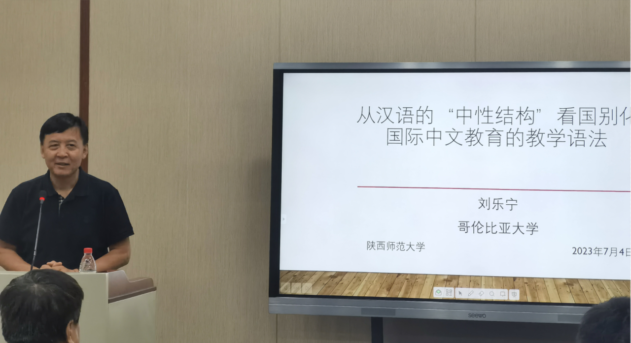 第一场讲座由刘乐宁教授主讲,刘教授围绕“从汉语的‘中性结构’看国际中文教育的教学语法”展开。他首先总结了全球化背景下如何确定教学内容并实施教学,提出语法是核心,国别是趋势。国际中文教育的国别化首先体现在语别化。