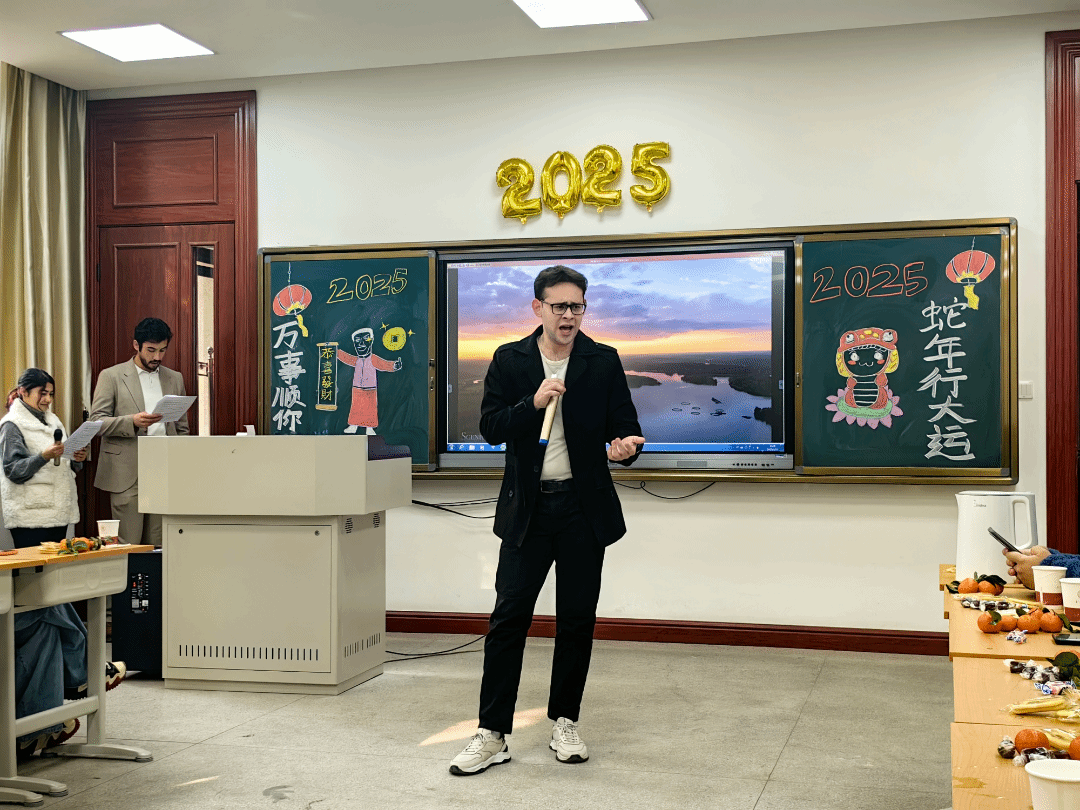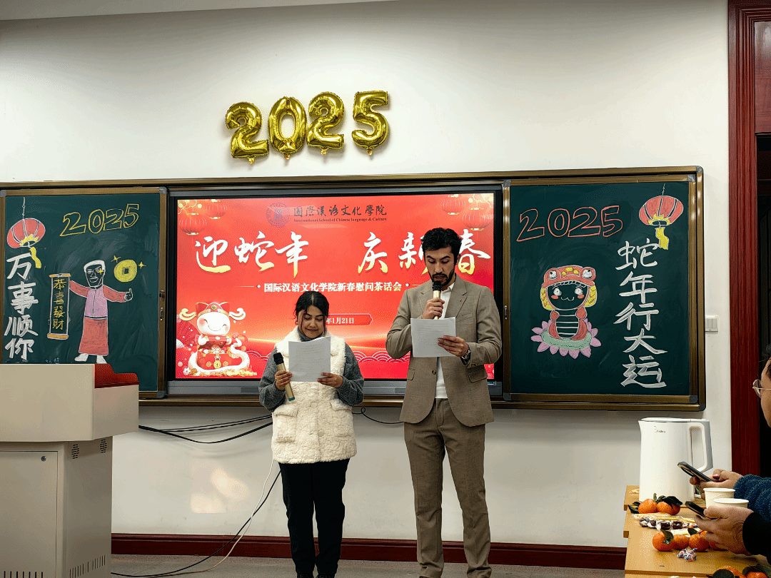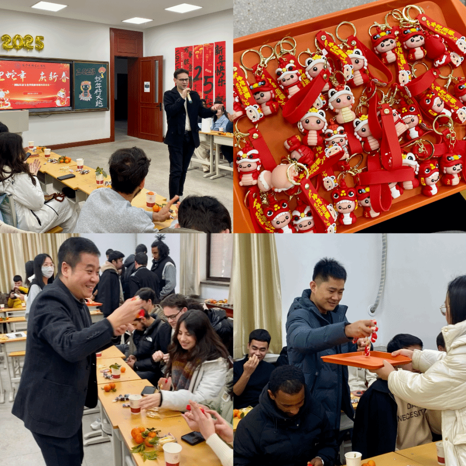 金蛇迎春,华章日新。在中国传统节日春节来临之际,365英国上市官方网站举办新春慰问茶话会,1月21日下午公司一层教室洋溢着节日的喜庆氛围,公司党总支书记马兰、副书记张昊、副经理贾泽林、副经理孙建伟、团委书记翁思洁、国际员工辅导员张欣元和来自二十多个国家的留校国际员工欢聚一堂,共同感受节日的浓厚氛围,深入了解春节文化知识。