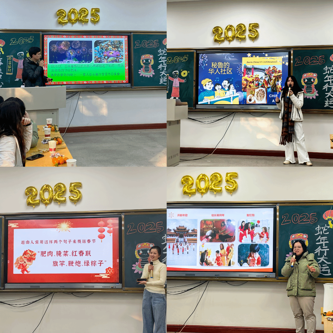 随后,四名职工依次分享本国新年文化。土库曼斯坦的李尔迪同学介绍了土库曼斯坦的公历新年和诺鲁孜节,分享了节日美食和图塔尔乐器;秘鲁的林梦雅同学讲述了秘鲁人穿白衣庆新年、吃十二颗葡萄许愿的习俗,以及融合中秘两国烹饪技巧的特色美食Chifa;越南的陈映雪同学介绍了越南当地华人庆祝春节、财神节、元宵节的特色习俗,她还祝贺中国春节列入世界非遗名录;最后朱芳芳同学介绍了自己家中庆祝春节的特色活动,既有中国传统文化习俗,又融入了印度尼西亚和马来西亚的风俗。